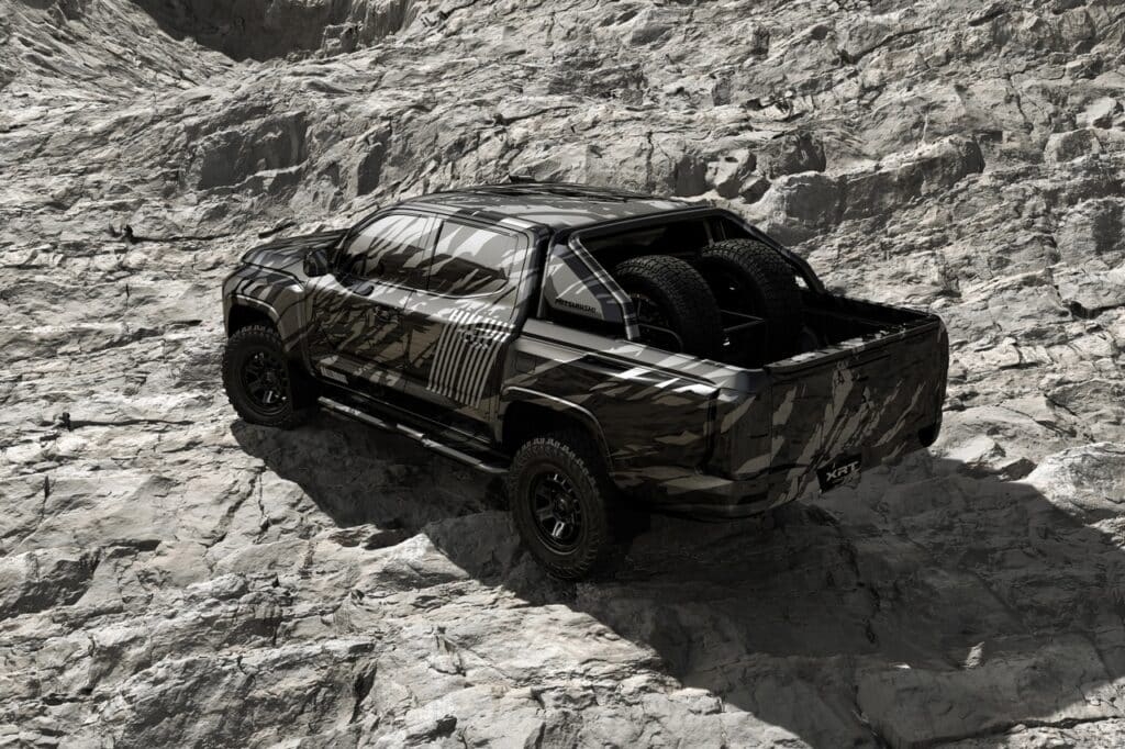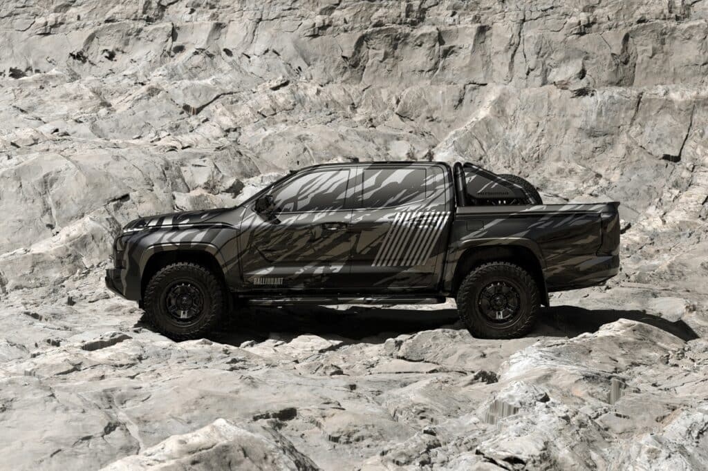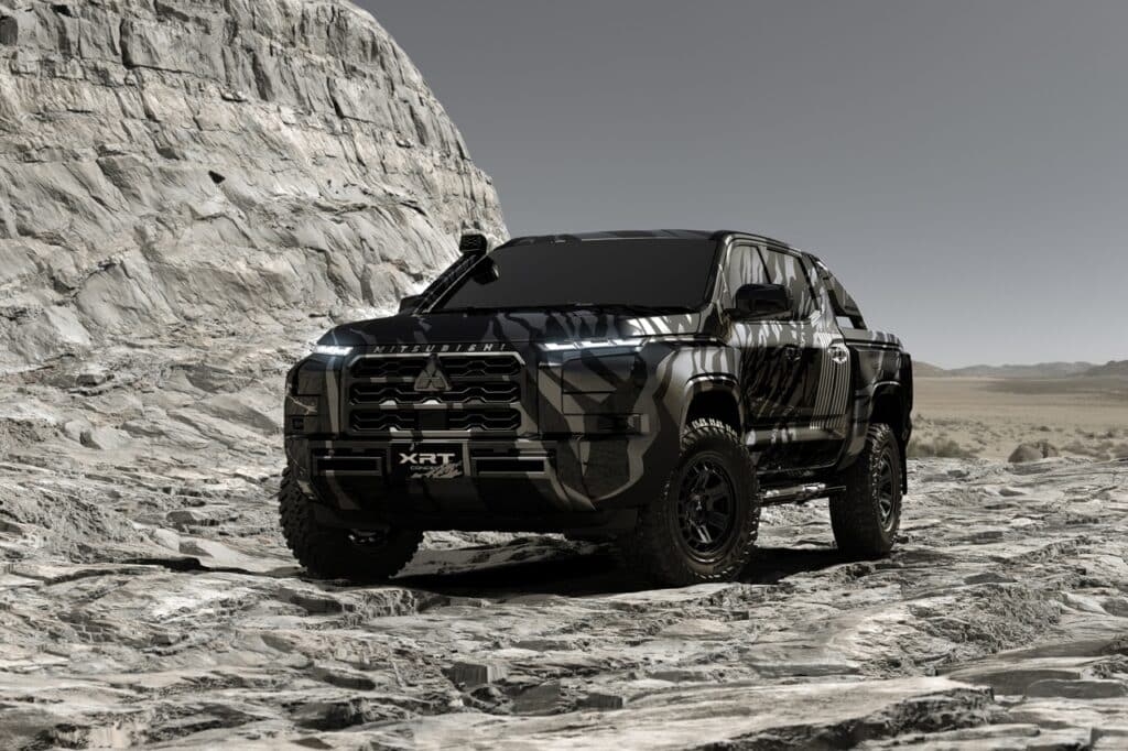 A concept car of the all-new Triton, the Mitsubishi XRT Concept is characterized by a fierce expression on the front and a robust hood that continues to the side with bold, horizontally-themed styling. Further, the concept car is fitted with front and rear over fenders as well as mud-terrain tires, giving it the powerful drive to compete in grueling rallies and the dynamism to dash across the terrain. The body features a camouflage design inspired by lava rocks packed with condensed energy, and the sides have been adorned with a graphic of the 10-parallel line Ralliart brand icon that expresses Mitsubishi Motors’ passion for driving.