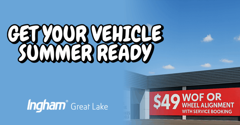 Get your vehicle Summer ready with Ingham Great Lake! Choose from bundling a $49 WOF or $49 Wheel Alignment with your service booking