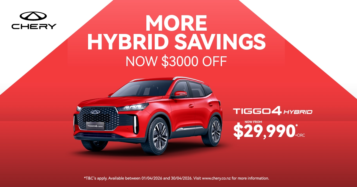 *Offer available on eligible new Chery Tiggo 4 Hybrid vehicles purchased between 01/04/2026 and 30/04/2026 and delivered by 30/04/26. Offer is not redeemable for cash or available to fleet, government or rental buyers. Not available in conjunction with any other offers. While stocks last. Chery Motor New Zealand reserves the right to extend, modify or withdraw this offer at its sole discretion.