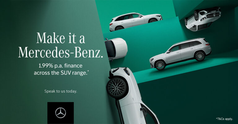 Enjoy 0.99% p.a. interest on the SUV range, including Mercedes-AMG and all-electric, financed over 24 months – 1/3 deposit, 1/3 in 2026 and 1/3 in 2027. *T&Cs apply.