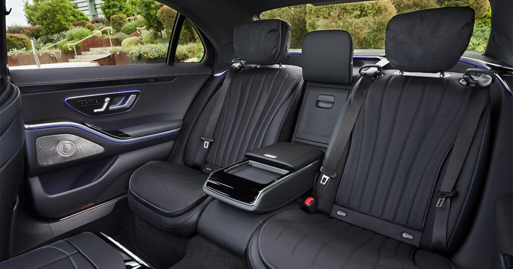 Rear-seat infotainment: Passengers in the rear can enjoy the same extensive infotainment and comfort features as the driver and front passenger via two 11.6-inch displays (optional) with touch controls on the rear of the front seat backrests. An MBUX rear tablet is also optionally available and as a fully-fledged tablet, can be used outside the vehicle. Screen content can be quickly and easily shared with other passengers, and selection and amendment of navigation destinations is possible from the rear seats.