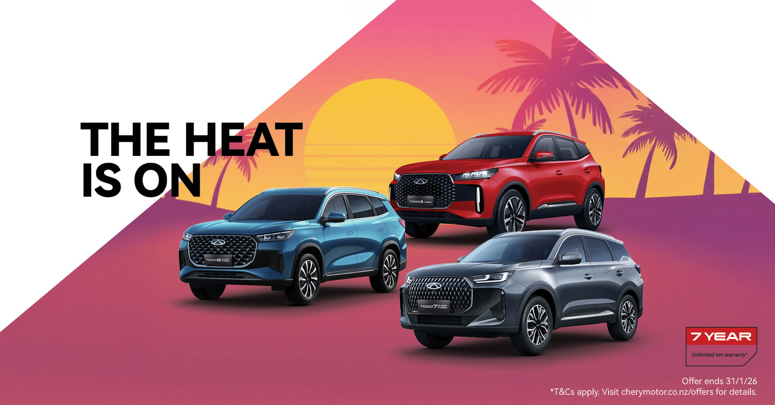 *Heat Is On Sale offers available on eligible new Chery Tiggo 4 Hybrid, Tiggo 7 Super Hybrid and Tiggo 8 Super Hybrid vehicles purchased between 01/01/2026 and 31/01/2026 and delivered by 31/06/2026. While stocks last. Offers are not redeemable for cash and are not available to fleet, government or rental buyers. Offers cannot be used in conjunction with any other promotions. Chery Motor New Zealand and Ingham reserve the right to extend, modify or withdraw this offer at its sole discretion.