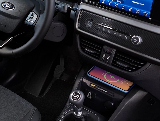 An on-the-go battery boost. Ford added space and convenience. The Tourneo Courier interior features a handy central storage space with wireless charging for compatible smartphones.*