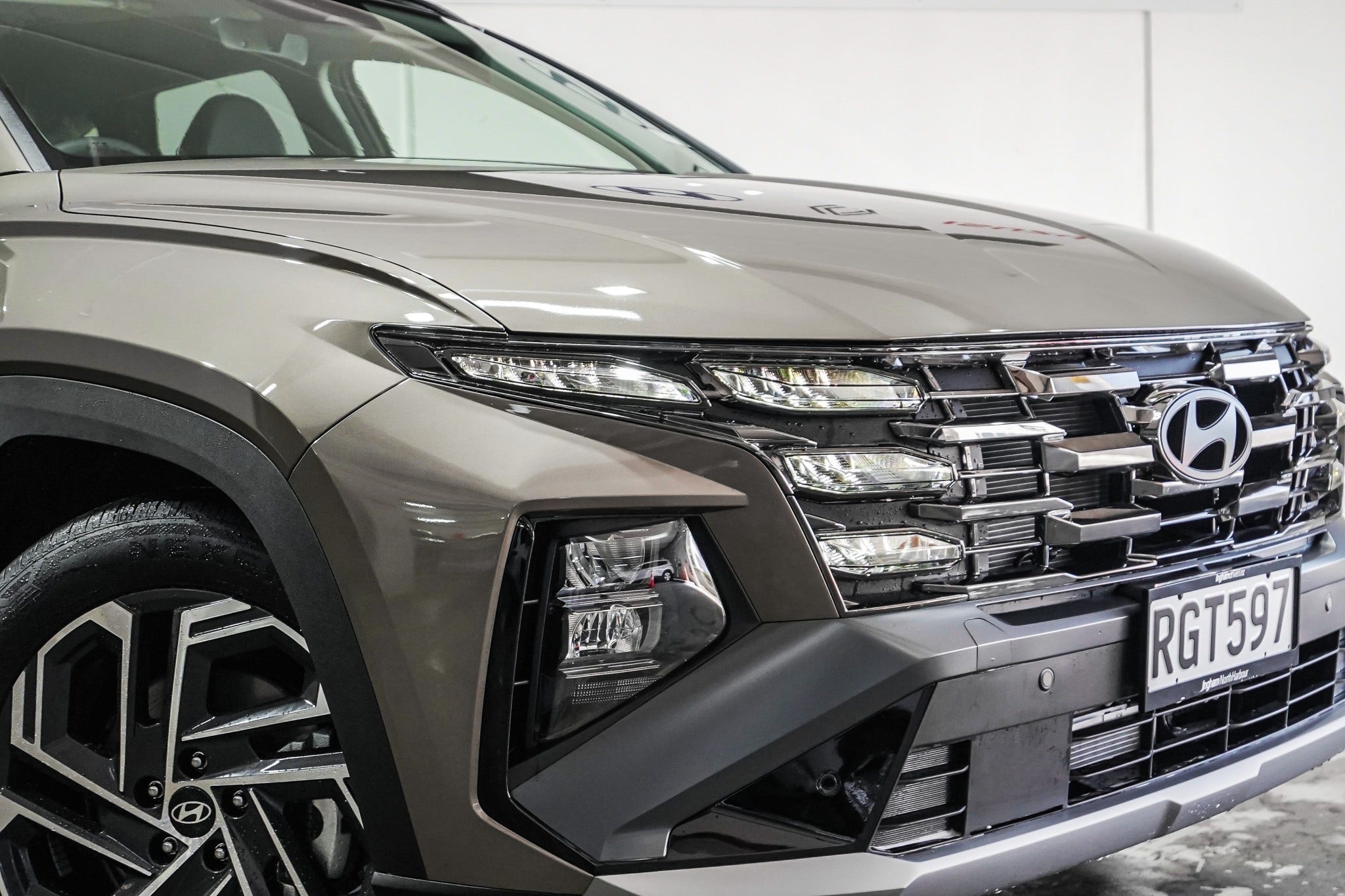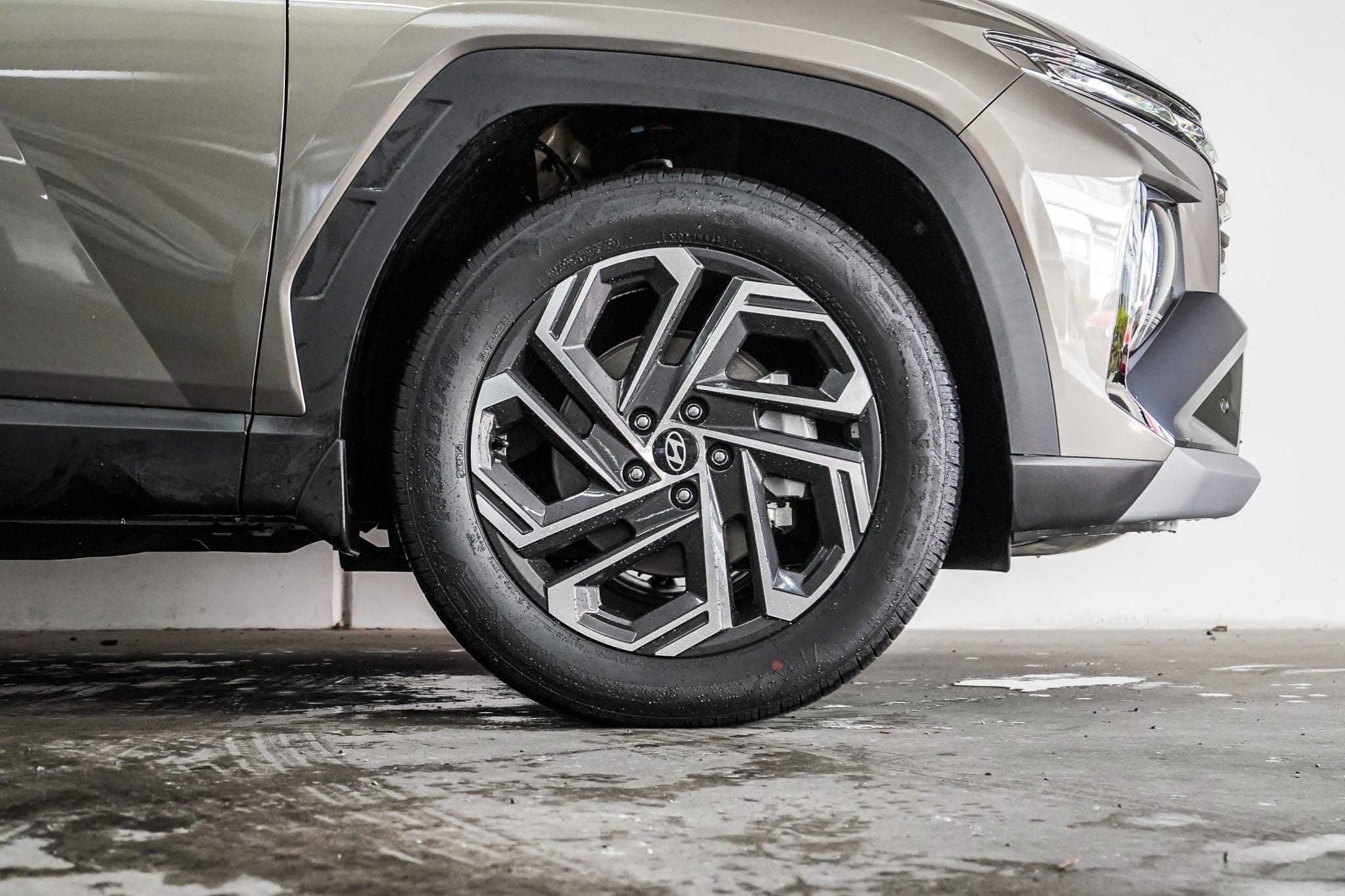 Tucson’s bold look features a sharp parametric grille, sculpted lines, and a wide stance. 19” alloy wheels, chrome window trim, and roof rails enhance both style and function. A clean rear profile completes its modern look.