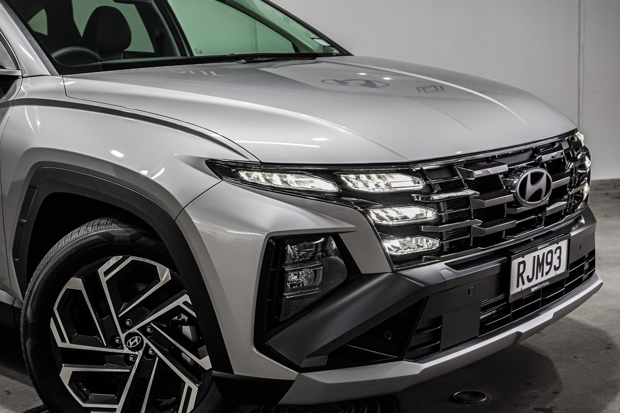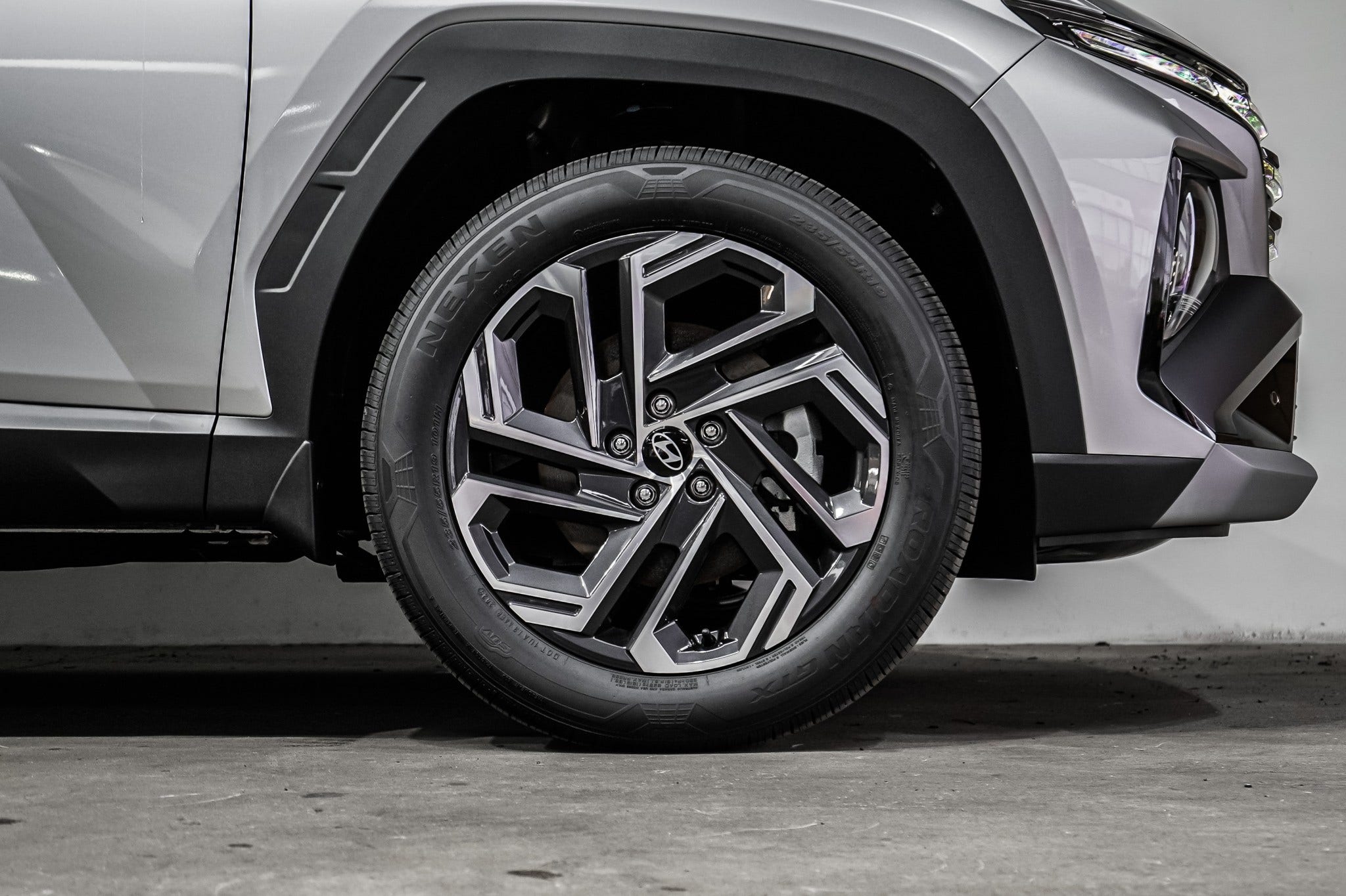 Tucson’s bold look features a sharp parametric grille, sculpted lines, and a wide stance. 19” alloy wheels, chrome window trim, and roof rails enhance both style and function. A clean rear profile completes its modern look.