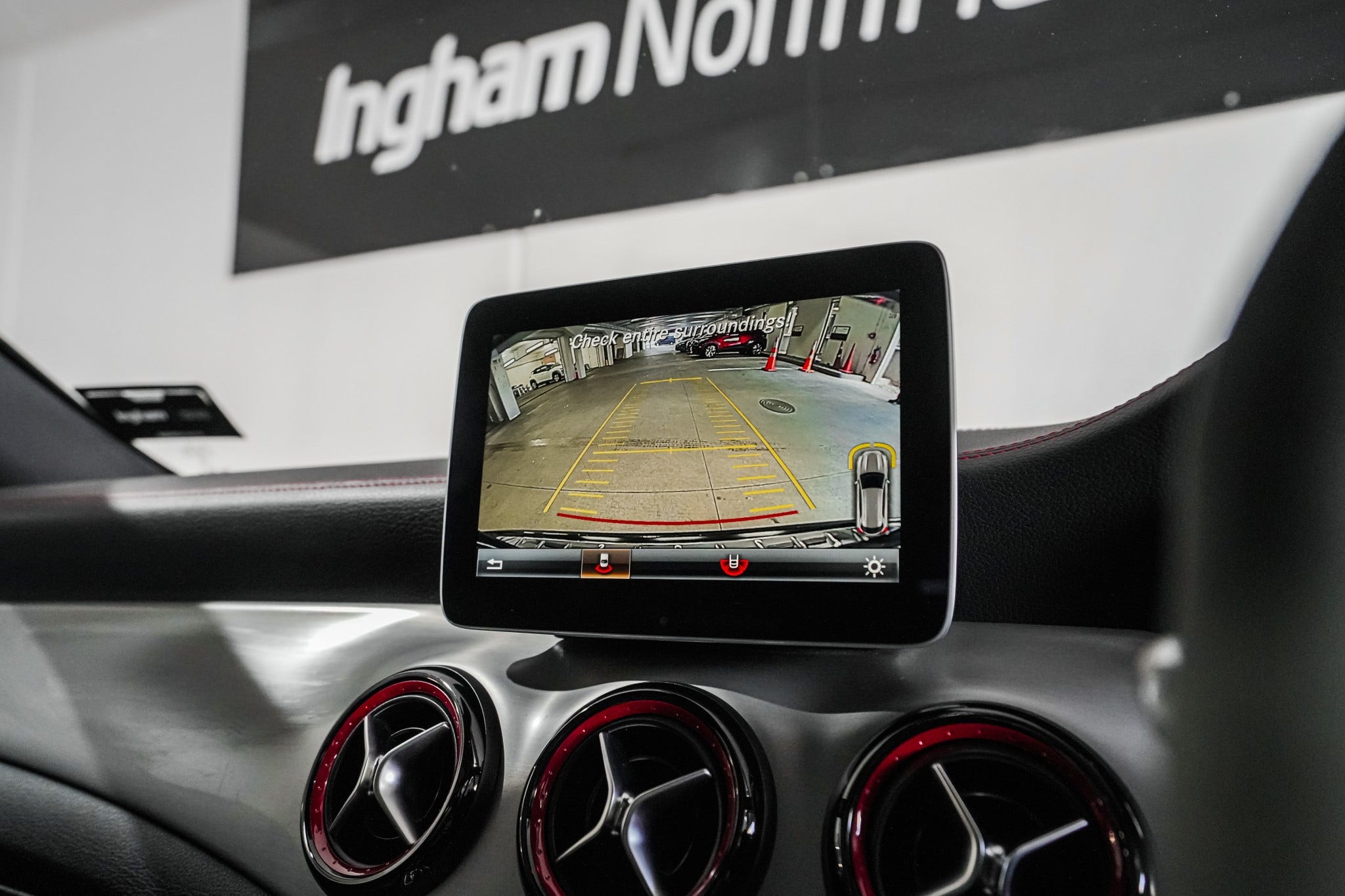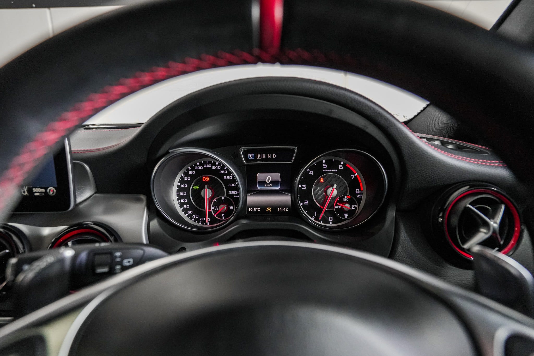 Finished with 20" AMG multi-spoke alloys, AMG Night Package, panoramic sunroof, privacy glass and signature twin-blade grille with red brake calipers, this NZ-spec example looks every bit as serious as it drives. Inside, the cabin is pure motorsport — AMG performance seats in RED CUT leather, flat-bottom AMG steering wheel in Nappa/DINAMICA, ambient lighting, Harman Kardon surround sound, COMAND Online navigation and AMG instrument cluster with RACETIMER complete an immersive cockpit